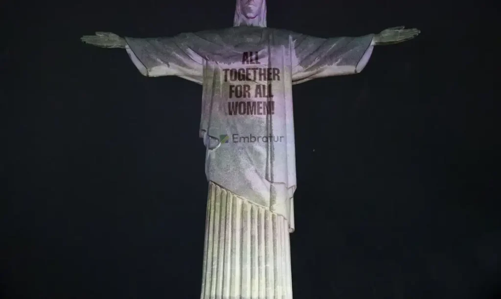 O Cristo Redentor foi iluminado na noite dessa terça-feira (3) com projeções de frases de combate à violência contra as mulheres durante o lançamento da campanha “Feminicídio Nunca Mais”. A iniciativa utiliza o futebol como plataforma de mobilização social rumo à Copa do Mundo Feminina da Fifa de 2027, que será realizada no Brasil.